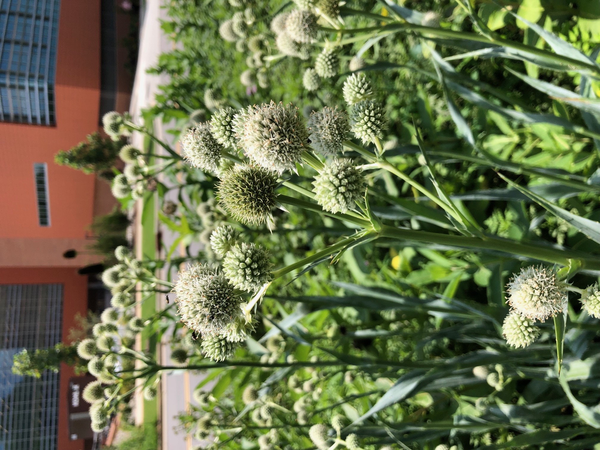 Rattlesnake master (Eryngium yuccifolium) is an unusual herbaceous perennial forb in the carrot family. Its bluish green foliage is almost always a rosette with a few rudimentary leaves on the flower spikes. The sword-shaped leaves have parallel veins, spiny margins and a pointed tip, resembling yucca leaves. A stiff upright stem holds a striking golf ball like flowers. The flowers attract many beneficial insects to the garden including flies, bees, and butterflies through mid-August. It is native to open woodlands and tall grass prairies of the central United States and is also distributed across many eastern states, including North Carolina. It may grow 4 to 5 feet tall and spread 2 to 3 feet wide. This plant works well in the middle of perennial borders or planted in small groups in open woodlands, naturalized areas, and pollinator gardens. A second variety (var. synchaetum) is also common to the coastal plains and wet savannas of southeastern NC to Florida. #whatsbloomingnc